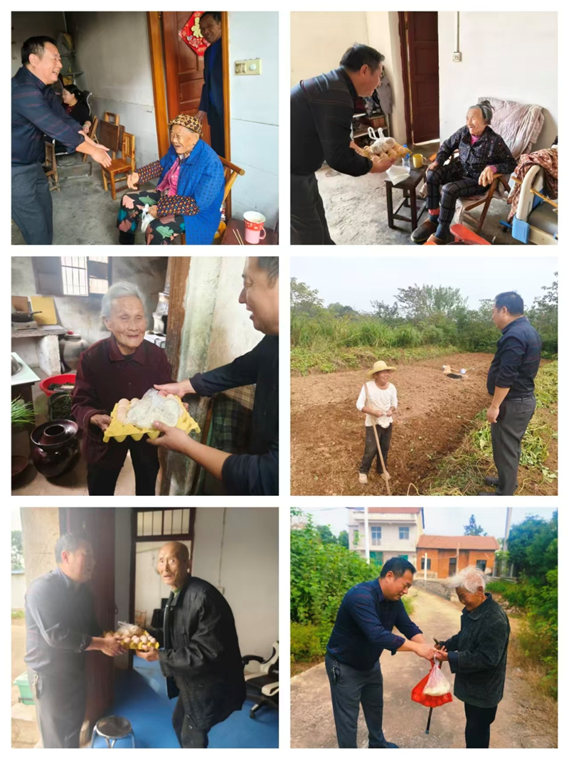 村书记陈瑶带队下湾组,为高龄、行动不便老人送去鸡蛋、包子等物资。在百岁老人刘玉华(105岁)、秦惠珍(102岁)家中,陈瑶书记与老人亲切握手、促膝长谈,详细询问其身体状况和生活需求,叮嘱老人保重身体,让老人们在秋日里感受到浓浓的暖意。