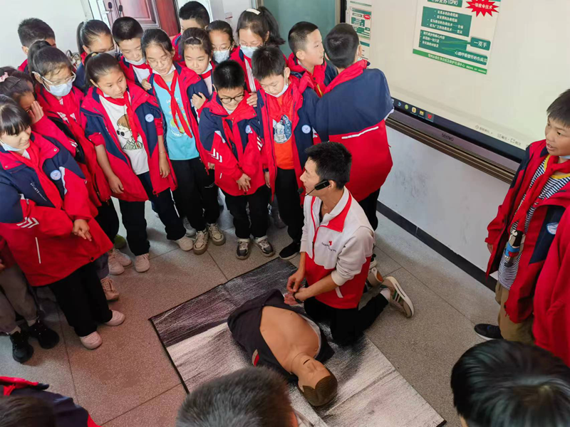 活动中,王老师还利用实物模型对四肢骨折的包扎方法等常见意外伤害的预防和急救处理措施进行示范教学。培训现场掌声连连,气氛热烈,师生们认真聆听,用心做笔记,教学成效明显。