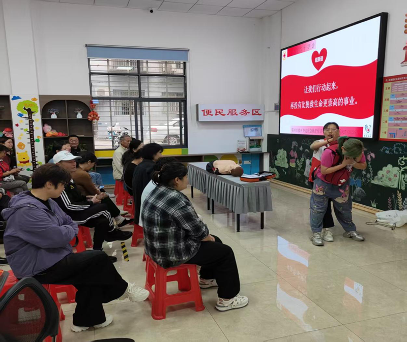 技能实训环节聚焦“救命技能”,市红十字会资深救护师杨俊带来心肺复苏(CPR)与自动体外除颤器(AED)实操教学。“心脏骤停黄金抢救时间仅4分钟,掌握 CPR 能为生命争取关键机会!”杨俊老师开篇点明技能重要性,随后借助人体模型,从意识与呼吸判断的“轻拍重唤”手法,到胸外按压“5-6 厘米深度、100-120次/分钟频率”的标准,再到人工呼吸时“仰头提颏、捏住鼻翼”的动作细节,均进行分步演示。在居民实操环节,她针对部分居民按压位置偏移、力度不足、吹气不到位等问题,手把手纠正姿势,确保每个人都能掌握核心要领。同时,现场还设置气道异物梗阻急救教学,通过“海姆立克法”演示,让居民学会应对儿童、成人不同场景的急救技巧。活动中,科普知识抢答、实操比拼等互动环节将氛围推向高潮。此外,工作人员还向社区居民、周边商户、过往群众发放了防灾减灾宣传手册等宣传品共计1000余份。