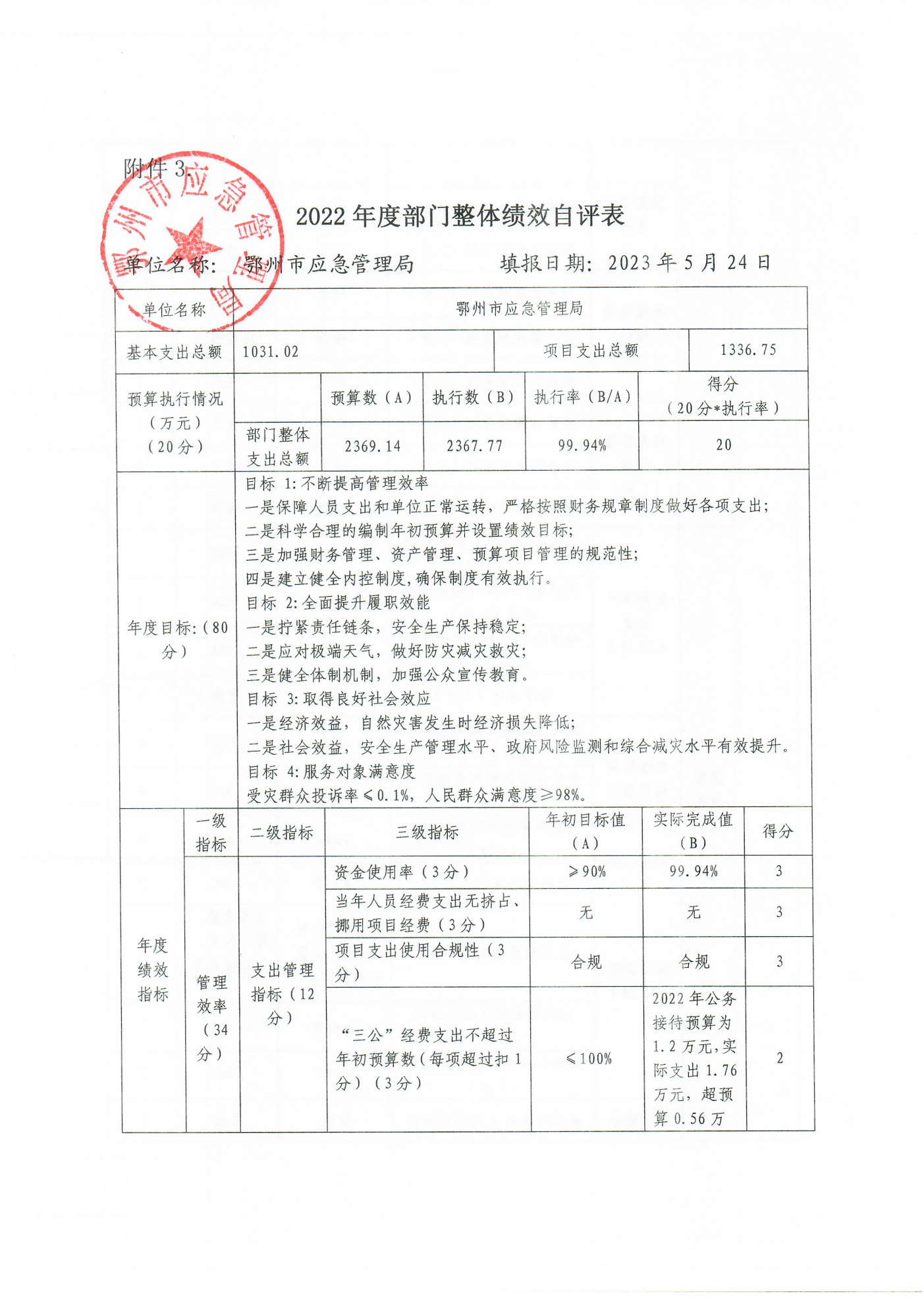 2022年度鄂州市应急管理局部门整体绩效自评结果