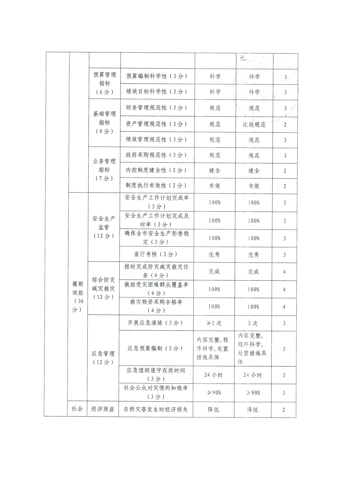 共涉及14个绩效指标,均已完成年初目标值。其中履职效能11个(安全生产工作计划完成率、安全生产工作计划完成及时率、确保全市安全生产形势稳定、省厅考核、按时完成防灾减灾救灾任务、救助受灾困难群众覆盖率、救灾物资采购合格率、开展应急演练、应急预案编制、应急值班值守在岗时间、社会公众对灾情的知晓率),社会效应3个(自然灾害发生时经济损失情况、防灾减灾知识普及率(%)、履行政府公共职责,执行救灾任务的效果)。